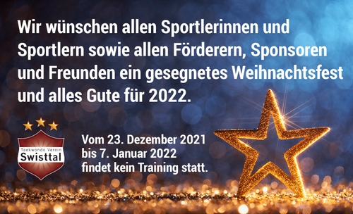 Mittwoch, der 22. Dezember 2021 findet das letzte Training statt. Am 10. Januar 2022 beginnt das erste Training wie gewohnt nach den üblichen Kurszeiten.